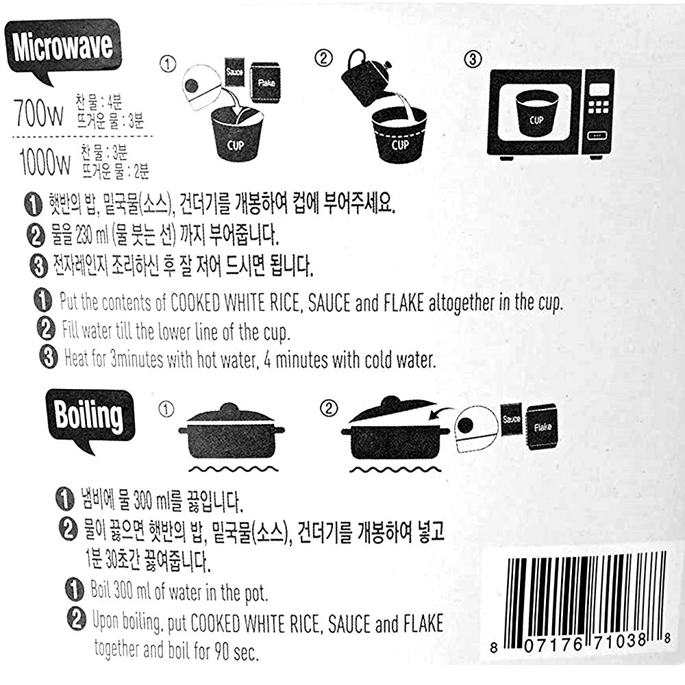 - Contains soup/sauce and microwavable cooked white rice